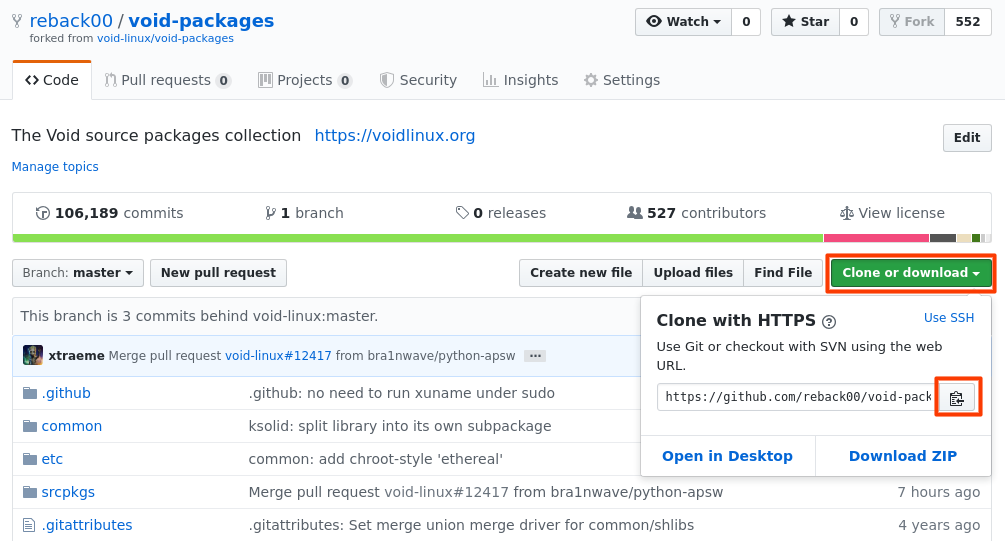 - Open a terminal and type “git clone” followed by a space and then the URL. e.g. git clone https://github.com/reback00/void-packages.git